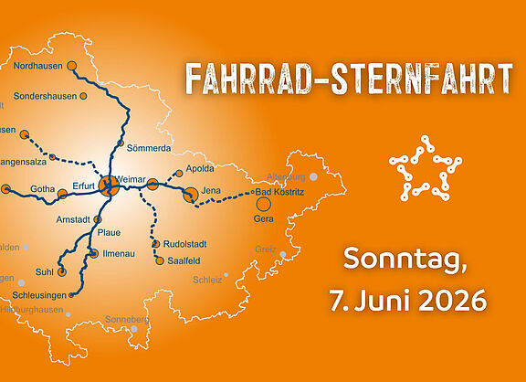 Für den 7.6.2026 plant der ADFC Thüringen seine erste Fahrrad-Sternfahrt. Gemeinsam radeln die Teilnehmenden aus ganz Thüringen nach Erfurt, um dort dem Thüringer Infrastrukturminister Steffen Schütz ein Forderungspapier zum Radverkehr zu übergeben.